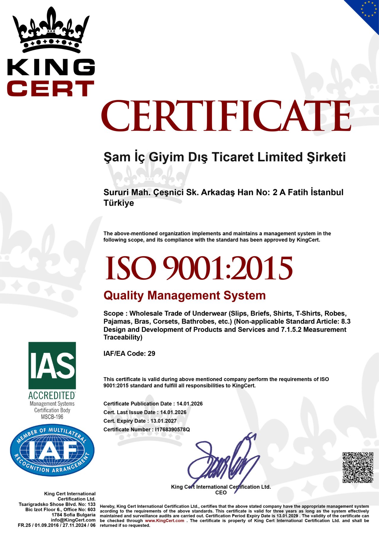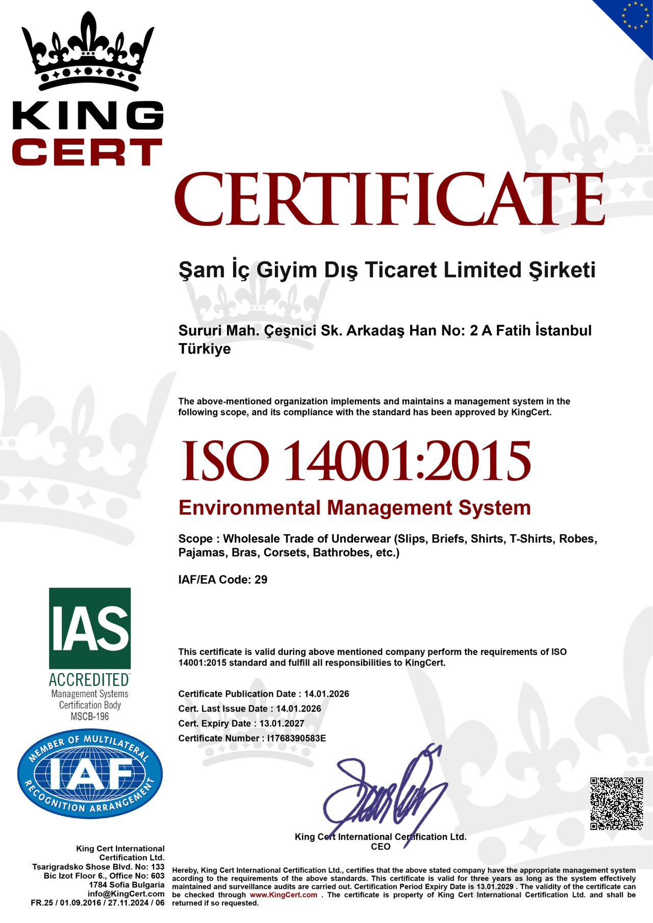 Şam İç Giyim 9001 2026-1 Şam İç Giyim 9001 2026-1 Şam İç Giyim 14001 2026-1 Şam İç Giyim 14001 2026-1 SASO – Compliance with Saudi product standards SASO – Compliance with Saudi product standards EAC – Compliance with Eurasian Economic Union standards EAC – Compliance with Eurasian Economic Union standards OEKO-TEX – Ensures safety for human health OEKO-TEX – Ensures safety for human health ISO 14001:2015 – Environmental Management System ISO 14001:2015 – Environmental Management System ISO 9001:2015 – Quality Management System ISO 9001:2015 – Quality Management System
