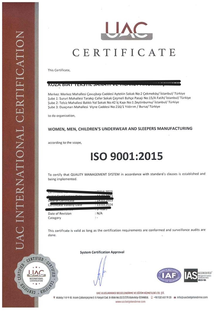 SASO – Compliance with Saudi product standards SASO – Compliance with Saudi product standards EAC – Compliance with Eurasian Economic Union standards EAC – Compliance with Eurasian Economic Union standards OEKO-TEX – Ensures safety for human health OEKO-TEX – Ensures safety for human health ISO 14001:2015 – Environmental Management System ISO 14001:2015 – Environmental Management System ISO 9001:2015 – Quality Management System ISO 9001:2015 – Quality Management System